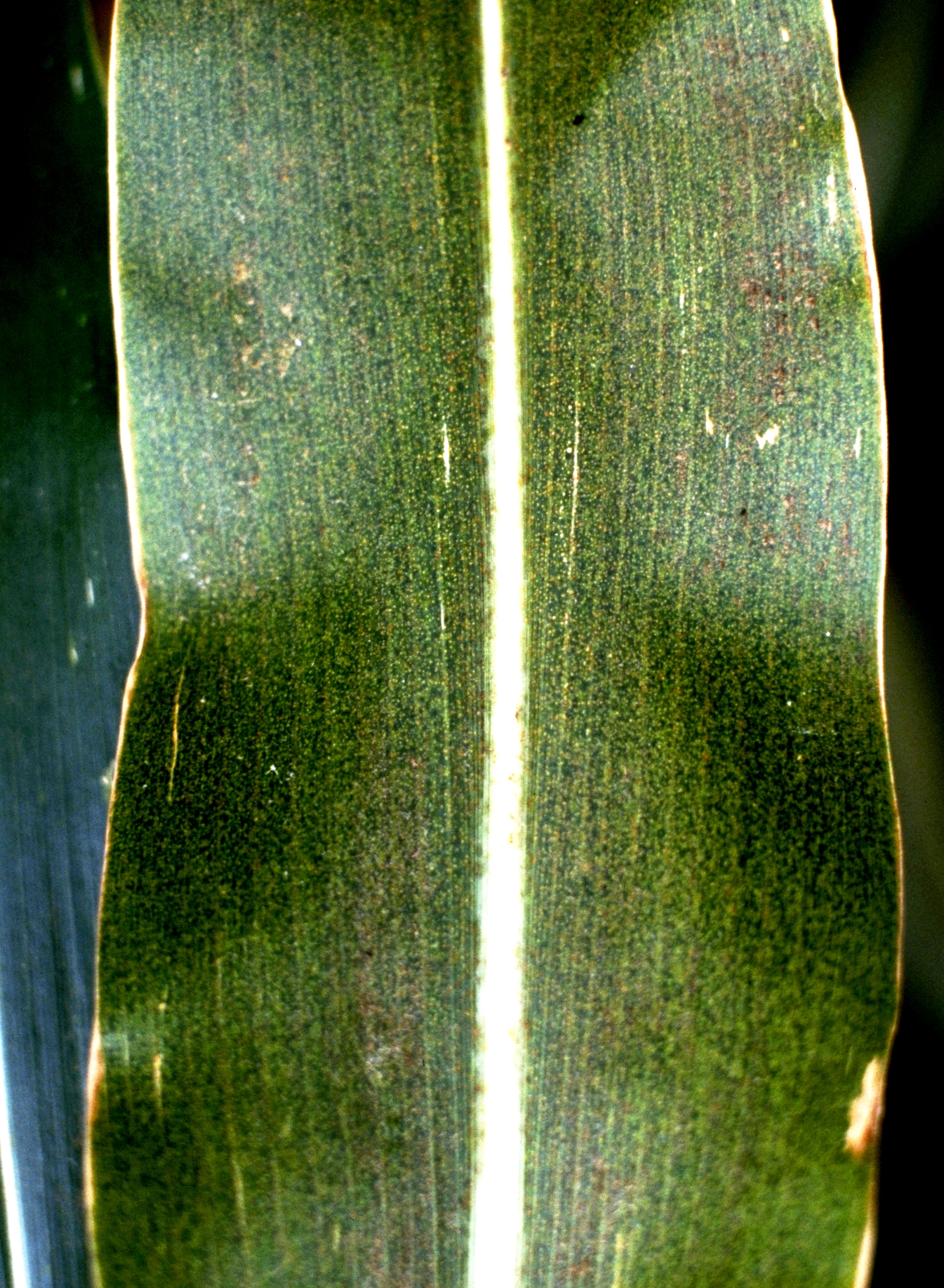 Section of the eighth leaf of a Les9-N2008/+ heterozygous mutant plant, M14/W23 background, showing profuse tiny lighter green pre-lesion spots.
