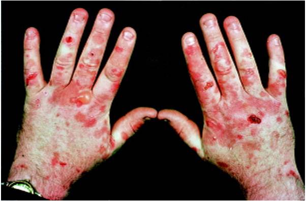 Eighth leaf of Les3-A781 homozygous mutant plant showing various sizes of necrotic lesions (extreme expression) (photo courtesy D. Hoisington)