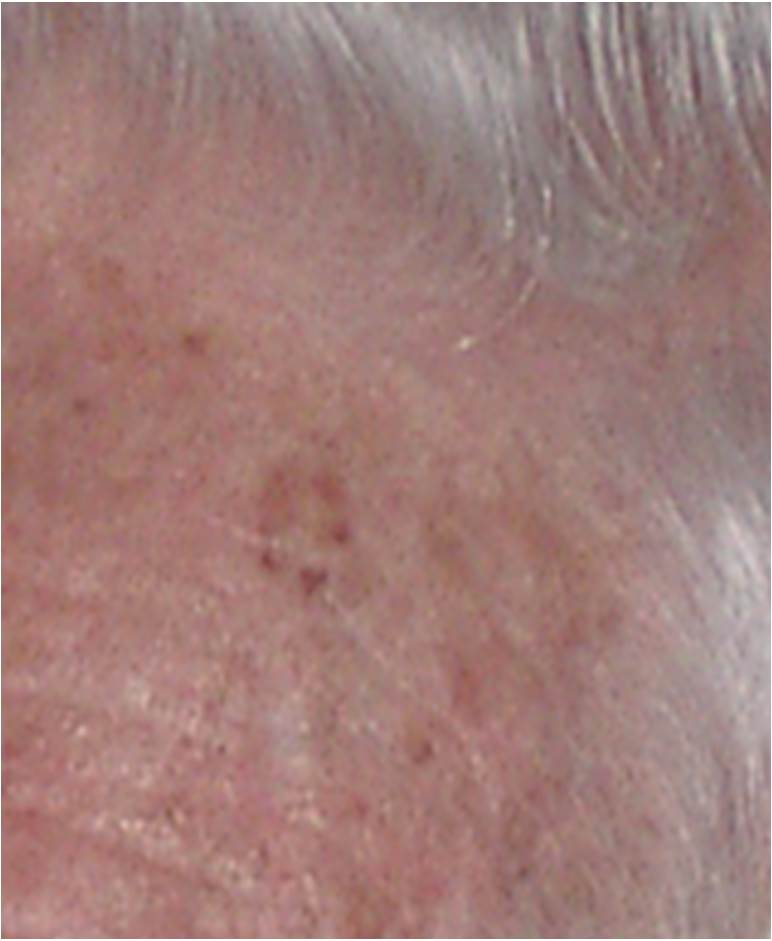 Cross-section of a mature 8th leaf from a Les5-N1449/+ mutant plant, showing many small chlorotic spots, some of which have bleached to white