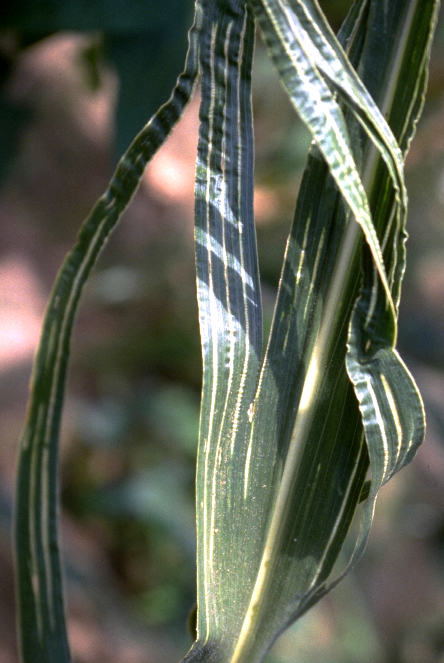 Vein tissue on leaf blade becomes yellow green, chlorotic, then necrotic and at flowering falls apart to produce a shredded leaf held together by alternate intact veins attached at leaf base and tip.