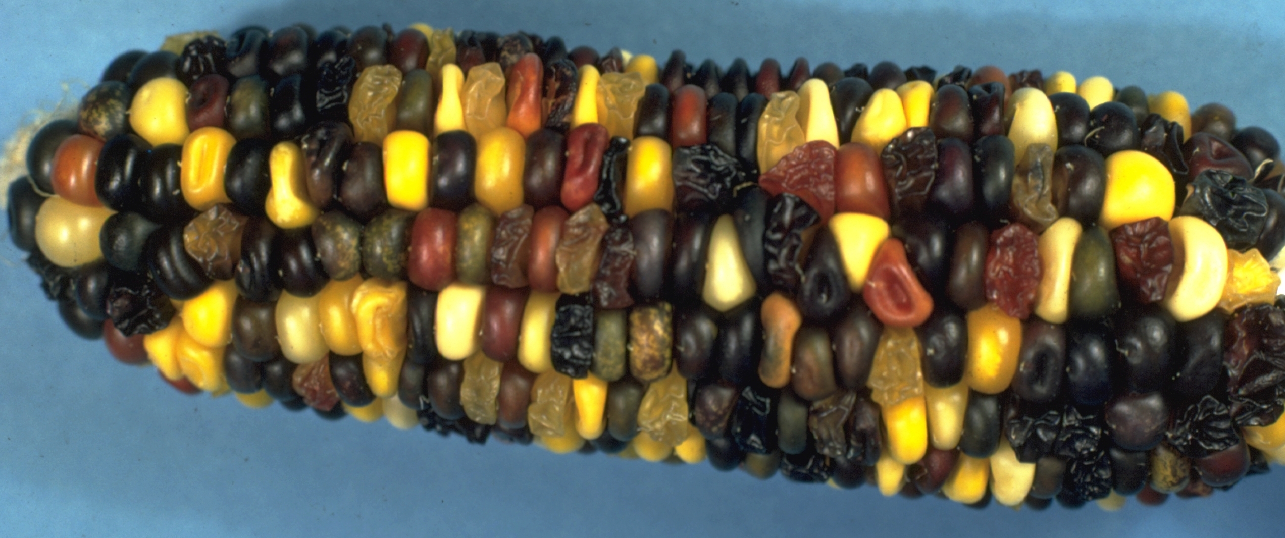 multi-gene interaction: Selfed ear segregating for multiple aleurone and endosperm genes: pr1 (red/purple), R1 (solid anthocyanin/mottled/colorless), su1 (sugary/normal), y1 (white/yellow endosperm), sh1 (shrunken/normal kernel), and wx1 (waxy/normal), in an intense, in1, purple popcorn background. A demonstration of gene dosage, gene interaction, independent assortment, and linkage; phenotypes of seven genes clearly displayed all on one ear!
