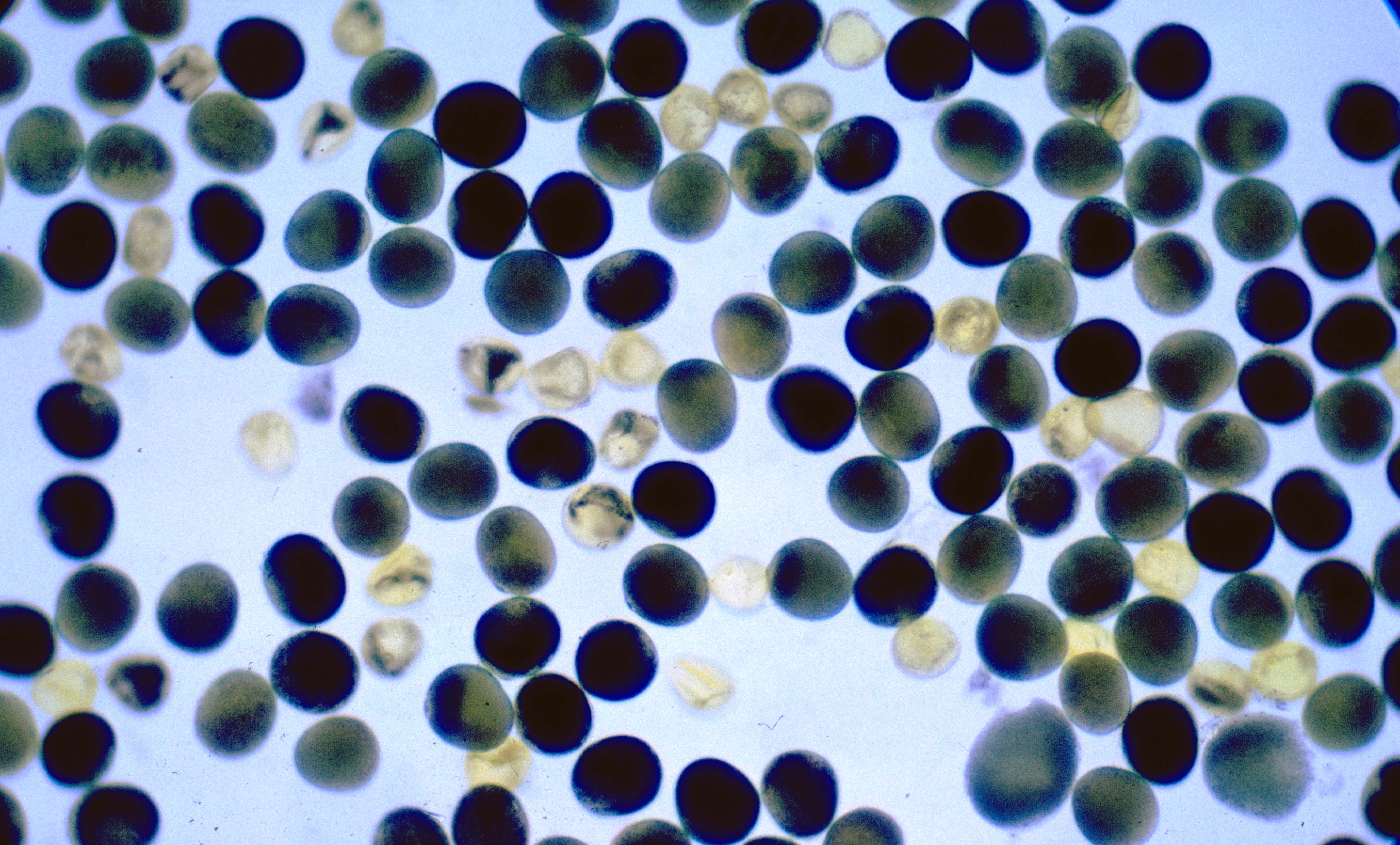 Pollen of a plant heterozygous for TB-9Sb wx stained with I2-KI to show semi sterility assortment of wx1 pollen abortion.
