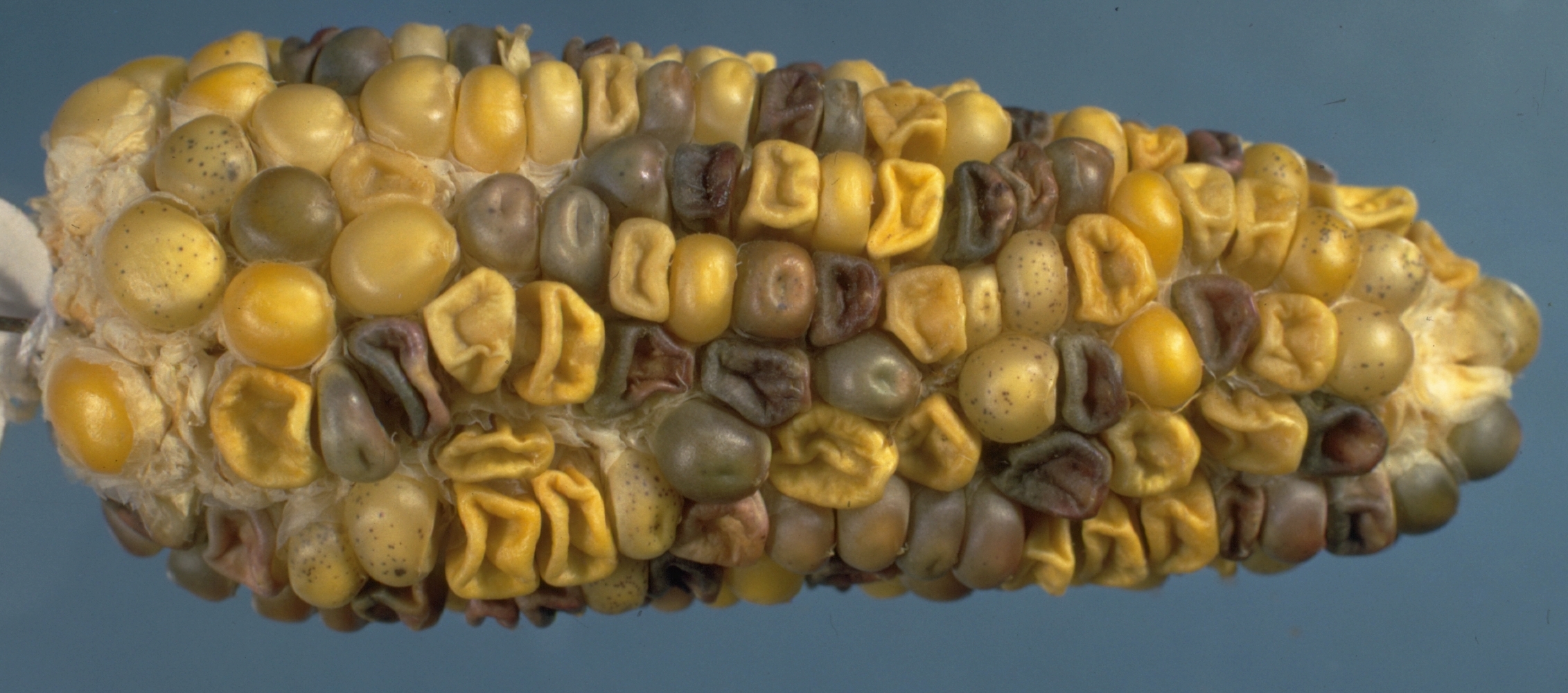 Trisomic 3 ear: An ear of trisomic 3 from the cross of trisomic 3 A1-d sh2/a1-m Sh2/al-s sh2, Ac, Dt1 dt1 x a1-s sh2s, Dt1 Dt1. Having the appropriate marker on each chromosome to identify trisomic carrying embryos. Pale non-shrunken kernels with dots will be mostly trisomic.